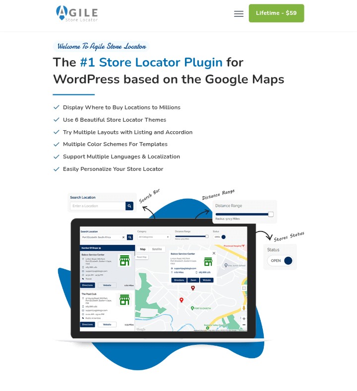 Are you looking for a plugin with an appealing UI and themes? Then try Agile Store Locator. It is a powerful WordPress store locator plugin for website developers and advanced users because of its numerous features and a management panel for backend users.
