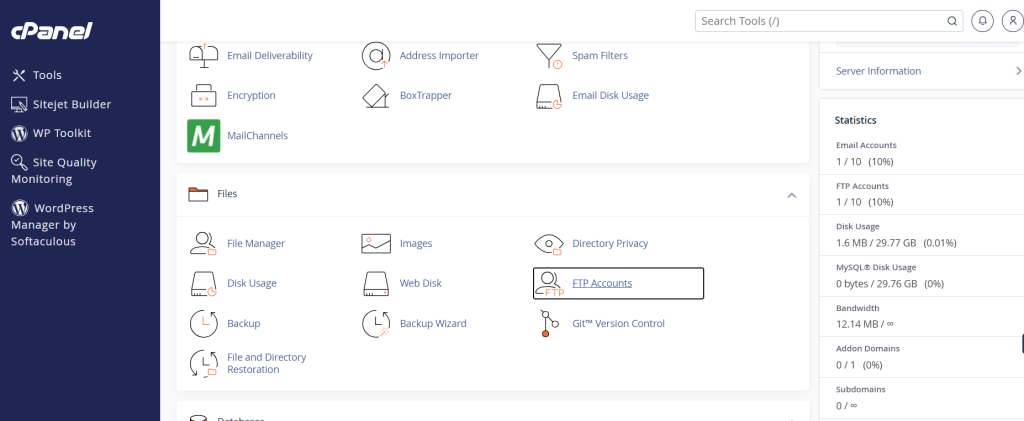 2. Go to the Files section. Search for the “FTP Accounts” option. Click on it.
