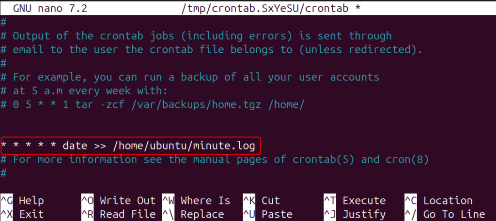 This command will append the current date to the file /home/ubuntu/minute.log every minute.