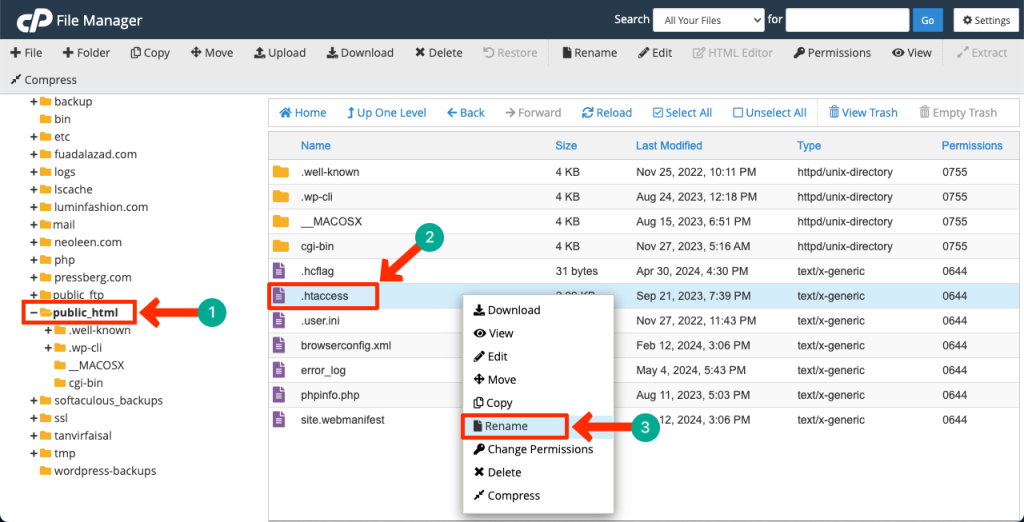 - Look for .htaccess in the public_html folder of the File Manager. Rename the file to disable it.