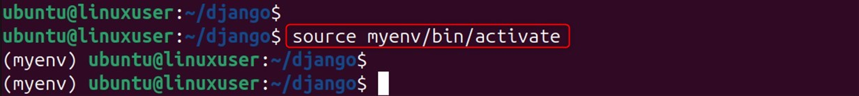 Finally, navigate to the Django repository. Then, set up the particular environment called ‘myenv’ using venv: