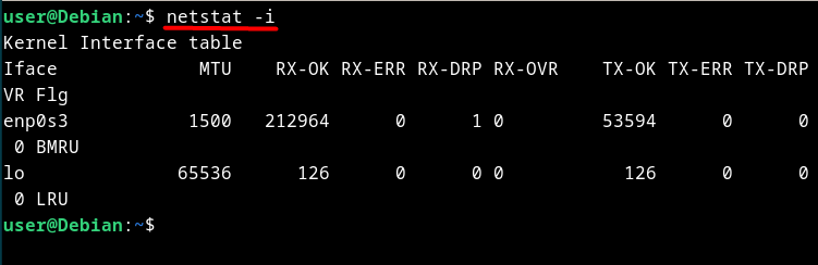 Add the “i” option next to netstat to display the network interface statistics. Use the command “netstat -i” to analyze the network interface on your terminal screen.